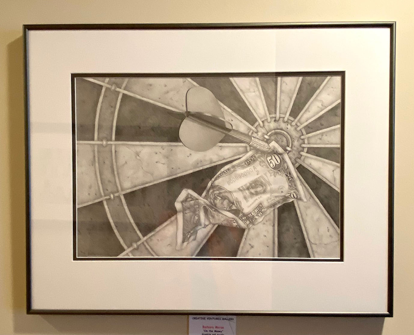 “On The Money” is a wonderful rendition of an old dart board with a dart targeting a $50 dollar bill. Can you look close and find the subtle addition of color?