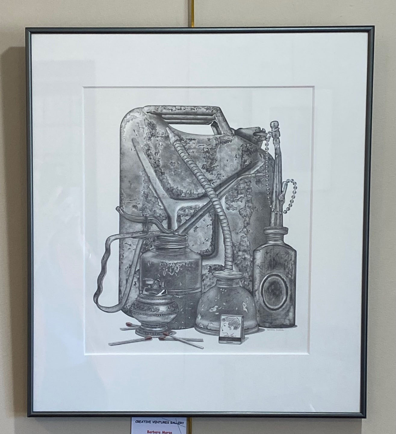 “Perfectly Matched” is a beautiful drawing of a group of old, rusty oil cans. Can you see the possible problem?