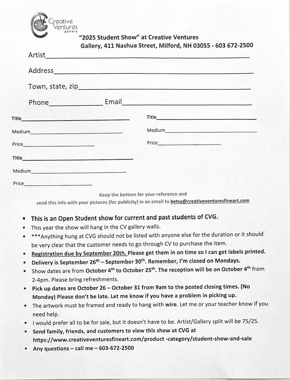Print out this year’s prospectus that is here – https://creativeventuresfineart-com.seethewebdev.com/wp-content/uploads/2025/06/2025-Student-Show-and-Sale.jpg and bring it in to me filled out before September 20th.