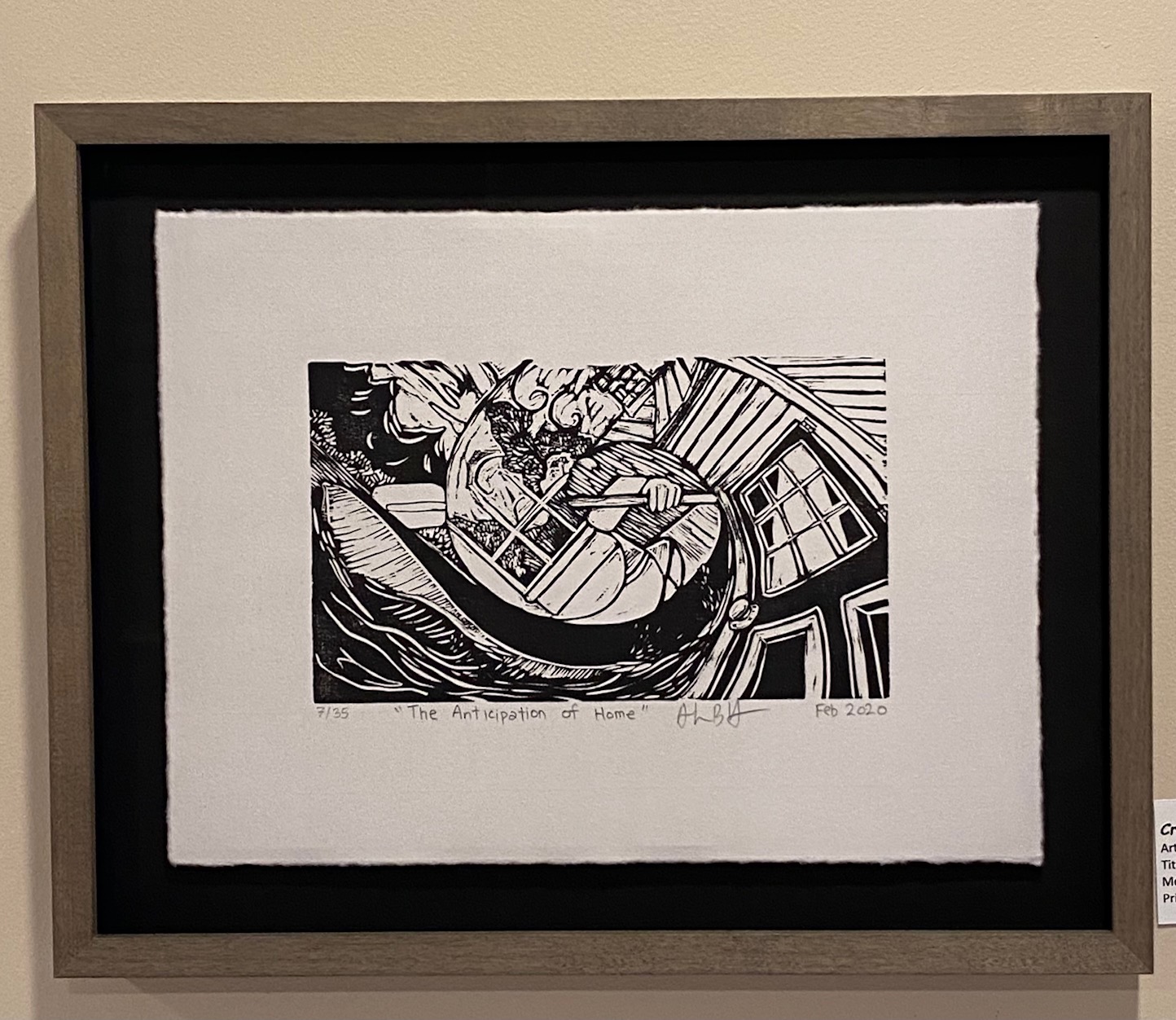 This is a stunning black and white woodblock print framed in a thin black frame with plenty of white space around the print. The design is based the Fibonacci spiral with a contemporary flare. This print is 7 out of an edition of 35.