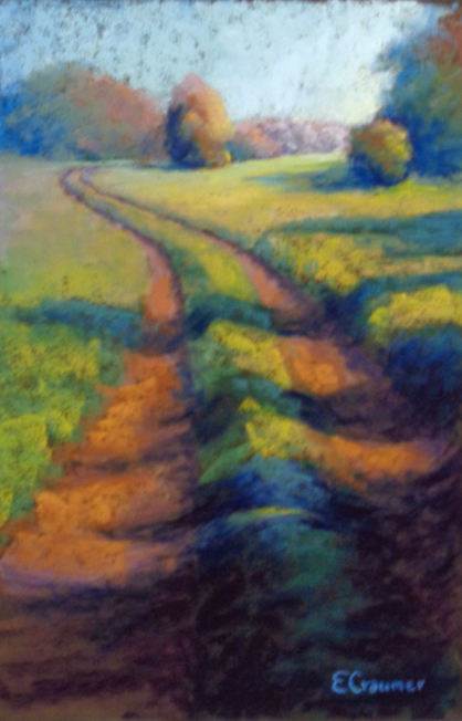Rich Colors characterize a pasture path and coax the viewer toward the distant sun-filled field ahead. Matted and framed in a contemporary 3/4″ black frame.