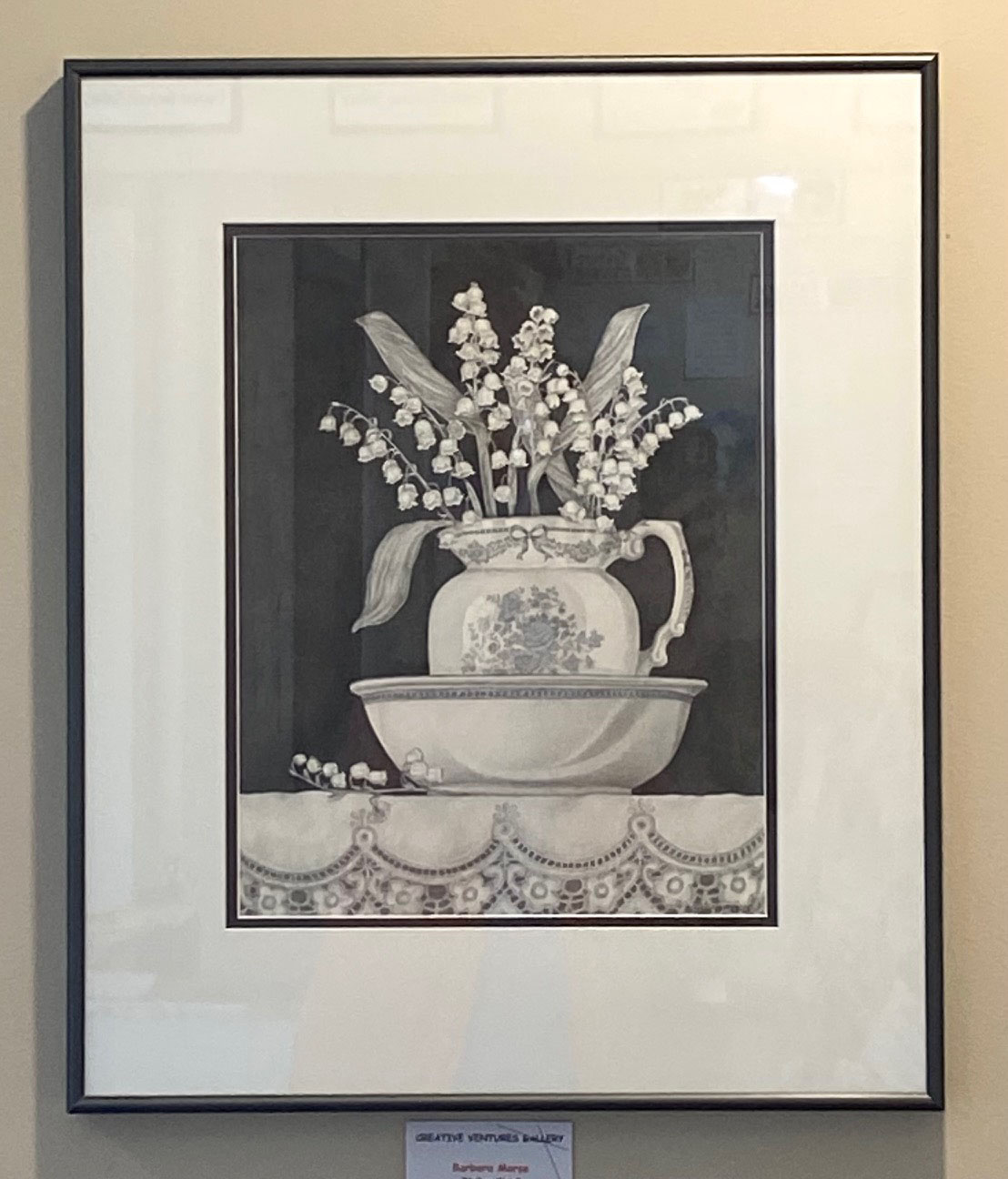 “Valley Girls” is a beautiful, nostalgic drawing of pitcher and basin now with lovely lily of the valley and lace. Look at how the color describes the shape of the pitcher.
